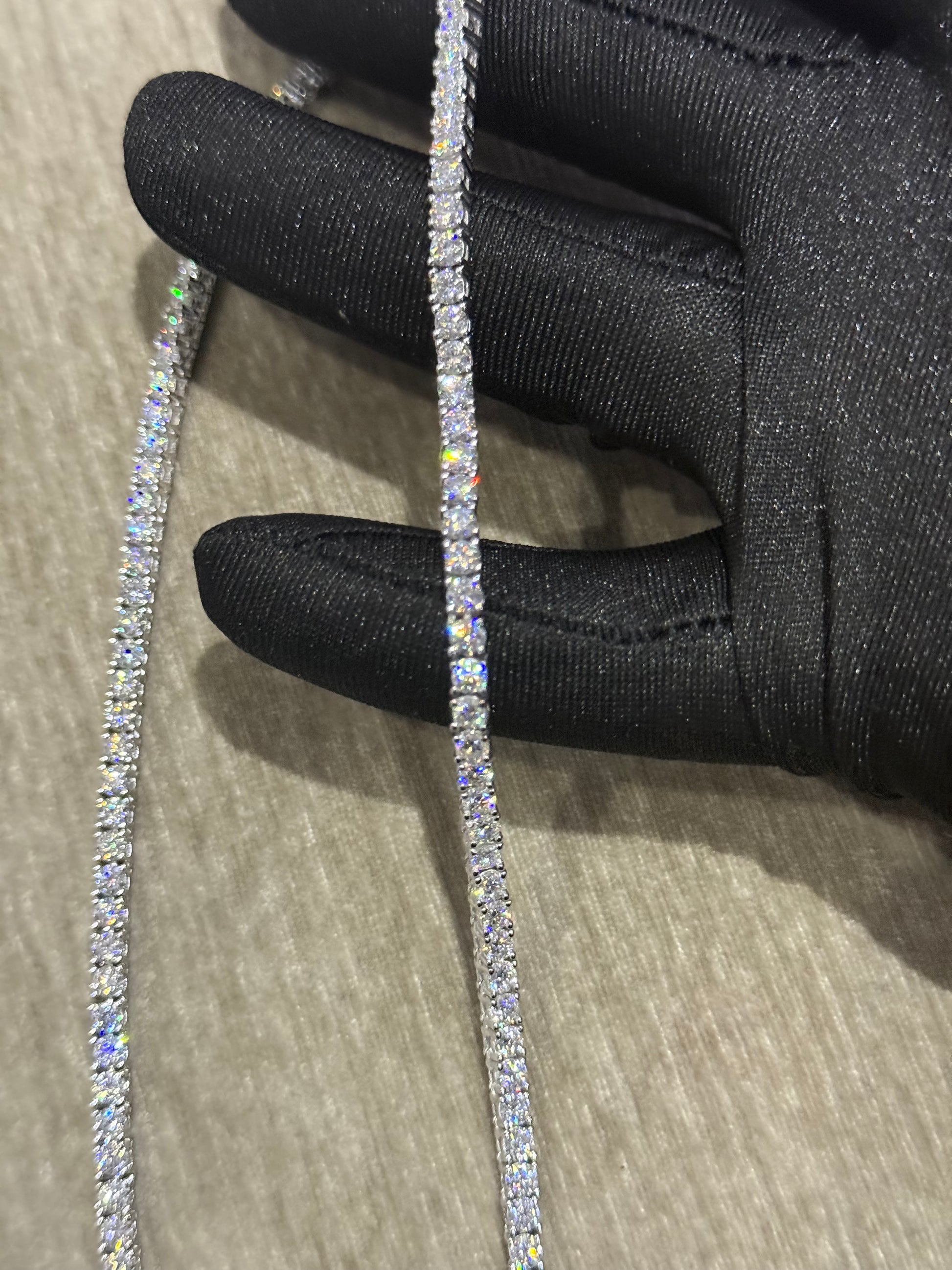 100 % Authentic VVS1 Quality 3mm Moissanite tennis chain. This beautiful tennis chain was crafted with solid silver that will never fade or change color. Every stone was hand set and has an excellent cut that shine very bright ! This beautiful tennis chain is in stock and ready to ship for fast delivery :)