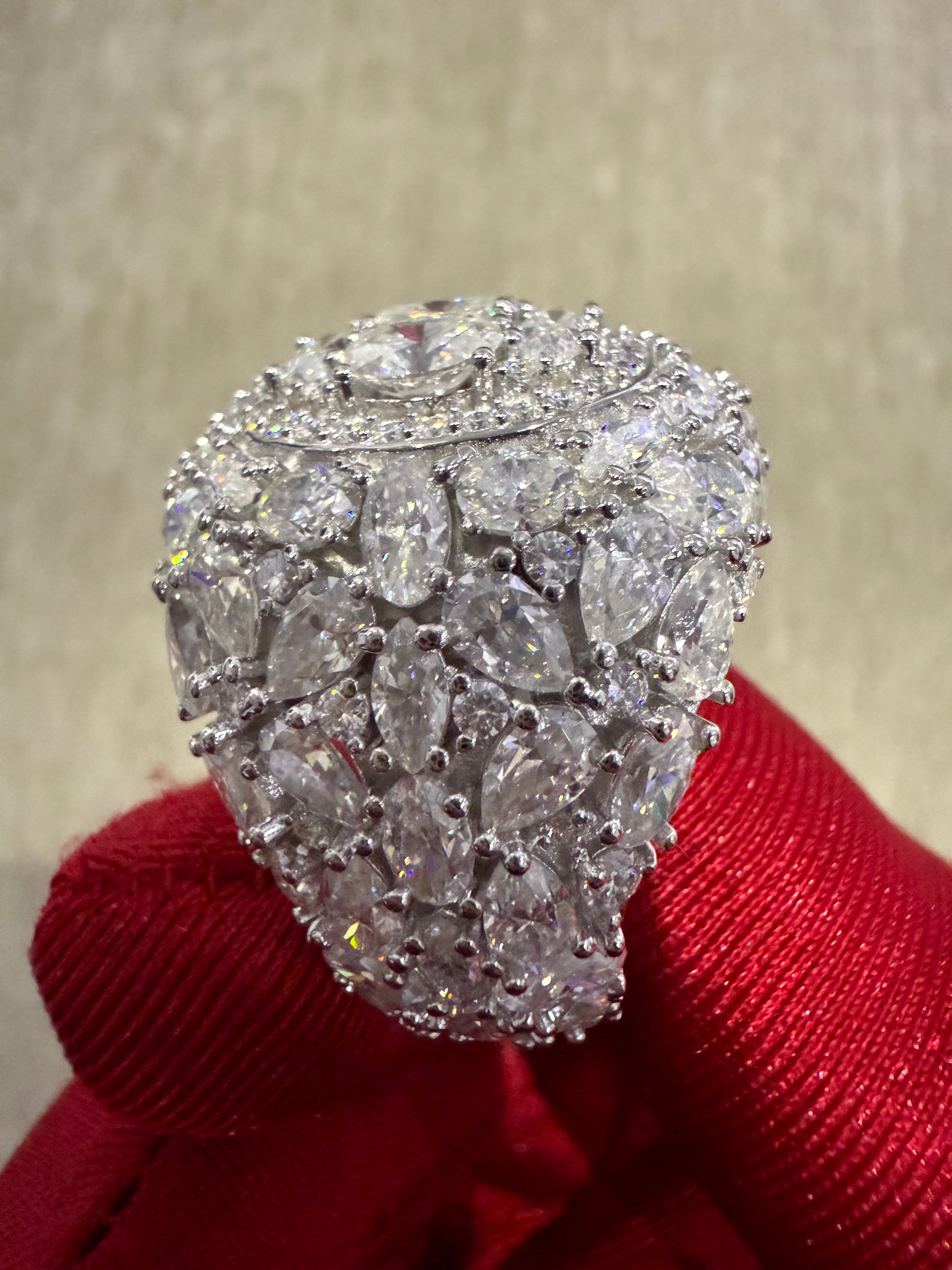 One of a kind Moissanite Master piece ring crafted by hand using a unique prong set cluster style setting. We used VVS1 Moissanite gems with excellent cut and different stone shapes giving this ring a look that really stands out and catches people’s attention. The shine on the master piece ring is absolutely Astounding ! Every single stone shines bright and crispy due to the high quality in stones and setting. This ring is size 10 and in hand ready to ship for fast delivery :)
